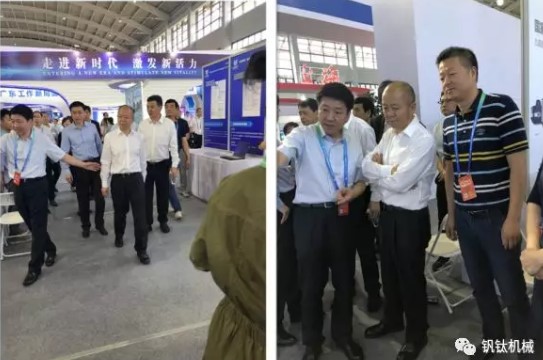 (國家工業和信息化部副部長王江平同志來浙江展團參觀)(左一浙江省經信委副主任-岳陽同志,中間國家工業和信息化部副部長-王江平同志,右一杭州釩鈦機械有限公司總經理-陳朝鋒先生)